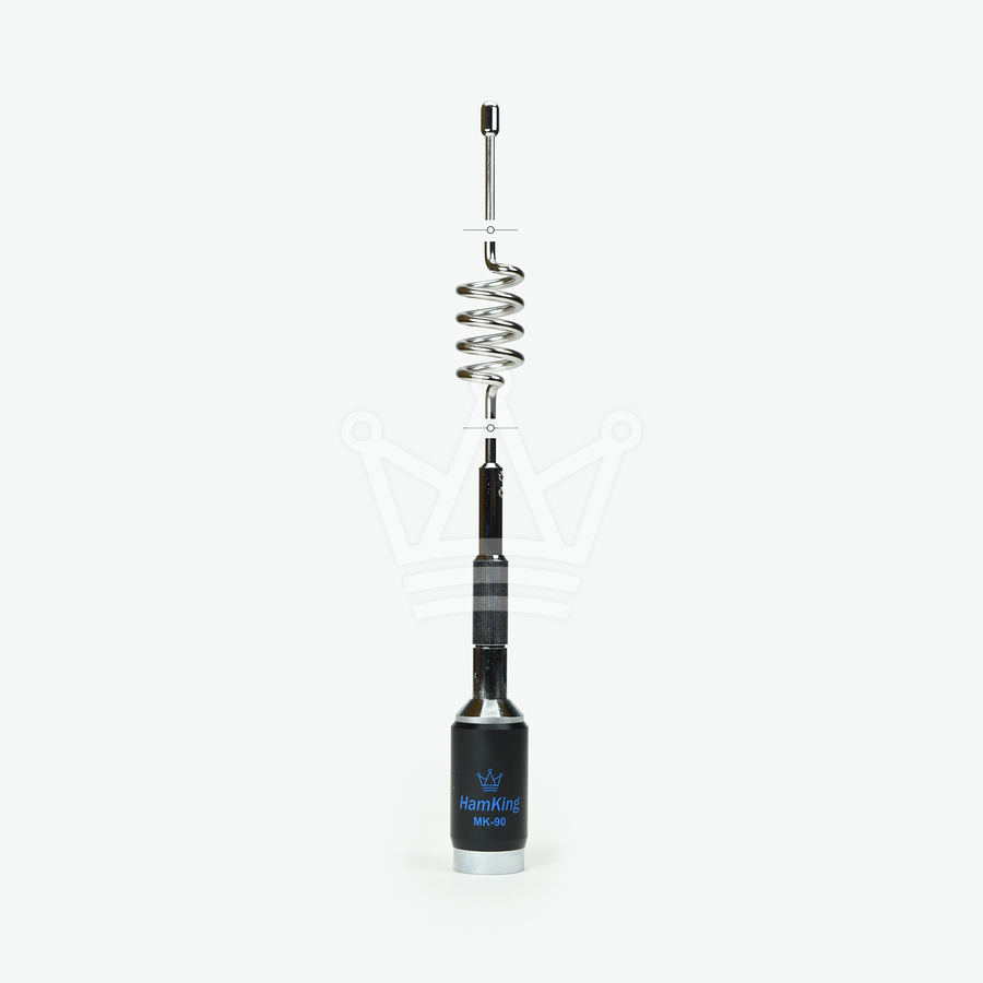 The HamKing MK-90 is a heavy duty pre-tuned mobile antenna, for best performance on 144 MHz and 430 MHz. With a maximum power handling of 350 watts on 144 MHz and 250 watts on 430 MHz. The whip is tiltable above the coil.