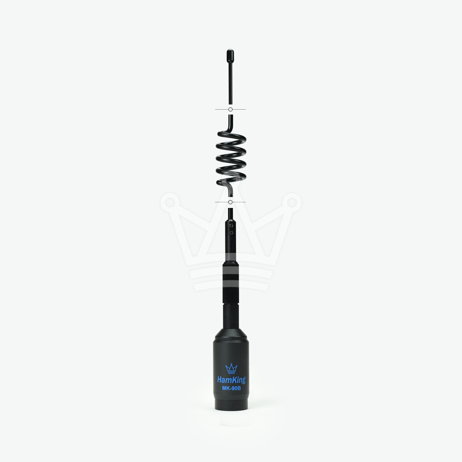 The HamKing MK-90B is a heavy duty pre-tuned mobile antenna, for best performance on 144 MHz and 430 MHz. With a maximum power handling of 350 watts on 144 MHz and 250 watts on 430 MHz. The whip is tiltable above the coil.